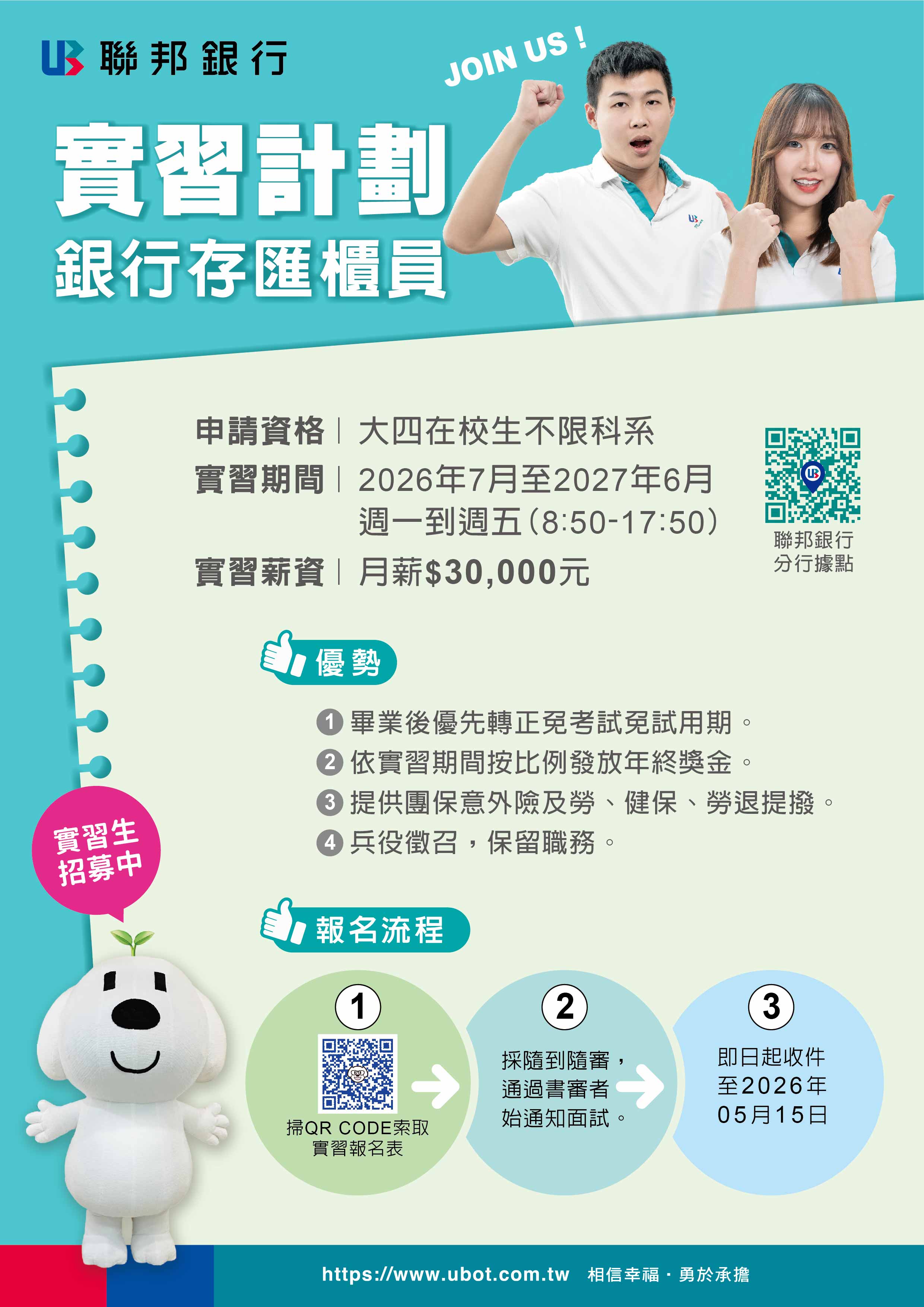 【實習】聯邦商業銀行2026年實習計畫資訊